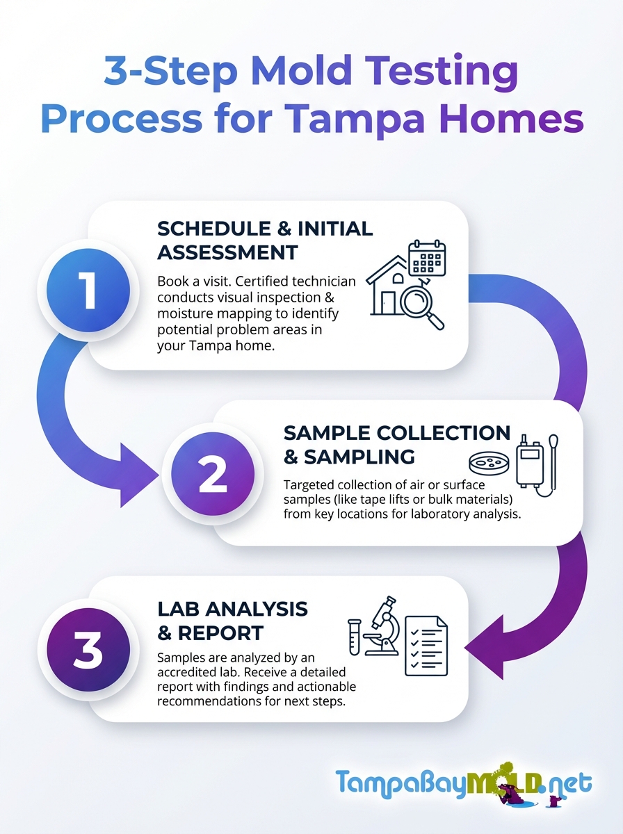 A clear 3-step mold testing process tailored for Tampa homes. It helps homeowners understand how testing works and what to expect.