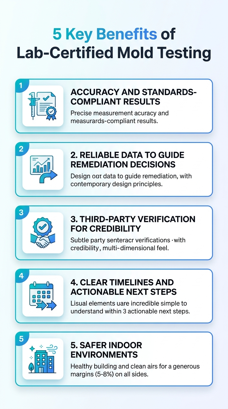 Five key benefits of lab-certified mold testing summarized in this infographic. It highlights accuracy, reliability, speed, and expert guidance.